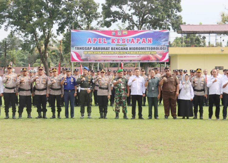 Jeritan Pematangsiantar – Kapolres Pematangsiantar, AKBP Sah Udur T.M. Sitinjak, SH., SIK., MH., memimpin pelaksanaan Apel Gabungan dalam rangka Kesiapan Tanggap Bencana Hidrometeorologi di Lapangan Kompi 2 Batalyon B Sat Brimob Polda Sumatera Utara, Jalan Ahmad Yani, Kelurahan Asuhan, Kecamatan Siantar Timur, Kota Pematangsiantar, pada Rabu, 5 November 2025, pukul 08.00 WIB.
